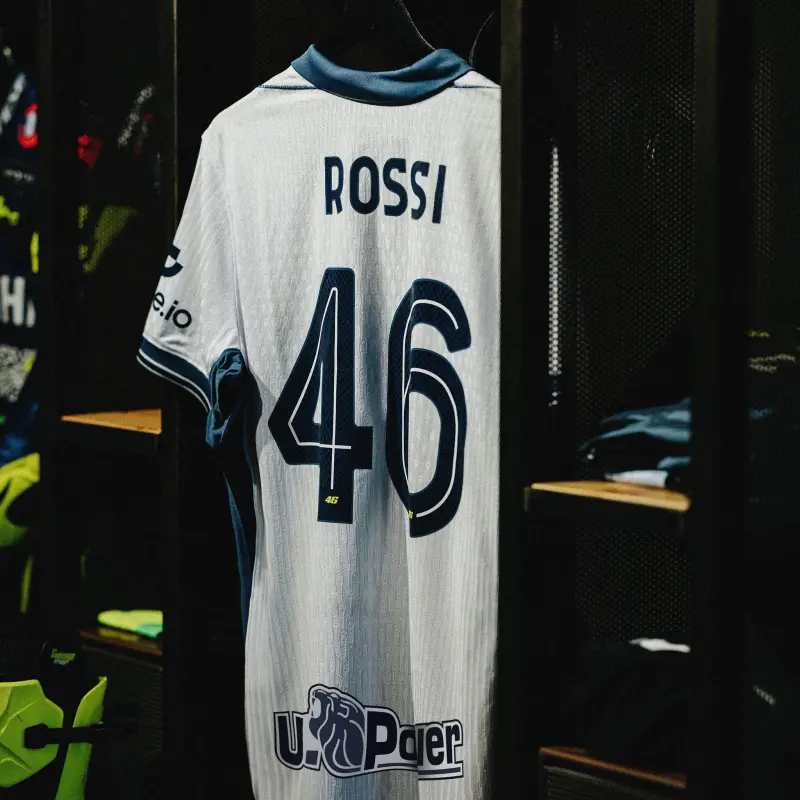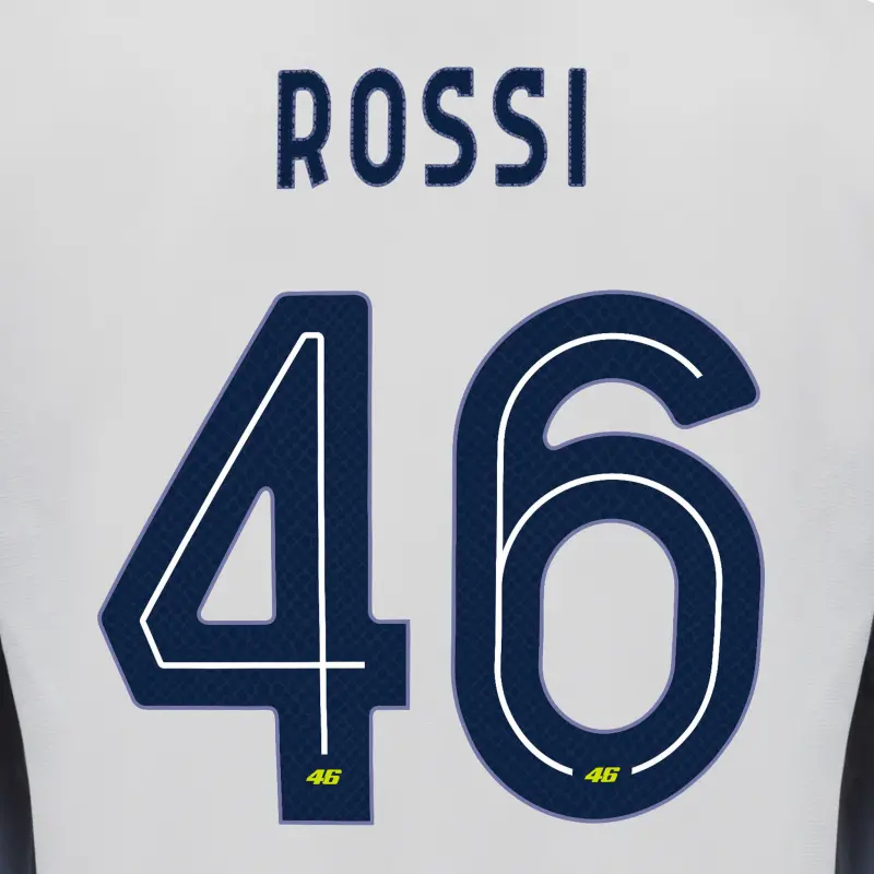Sonderausgabe des VR46 Auswärts-Stadiontrikots. Individuell gestaltetes ROSSI 46, mit speziellen Buchstaben und Zahlen, die Valentino gewidmet sind